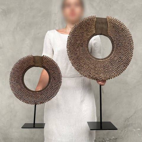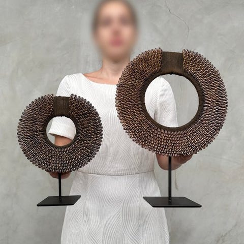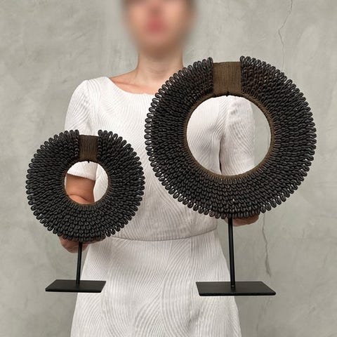 Koriste-esine (2) - Pair of white coloured tolai necklaces on custom stands -