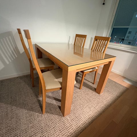 Ruokailuryhmä neljällä tuolilla. Pientä kulumaa kuten kuvista näkyy, mutta yleisilme siisti.