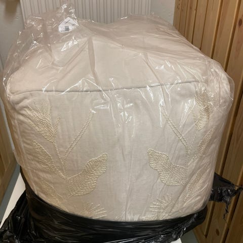 Ehjä ja siisti, Sotkasta ostettu aitoa nahkaa oleva rahi. Fylli on styreeniä, pientä styrox-palloa. Käytetty sivupöytänä, voi olla vähän pientä tahraa, joka lähtee kostealla pyyhkimällä. Koko: korkeus 30 cm, leveys ja pituus 40 cm.