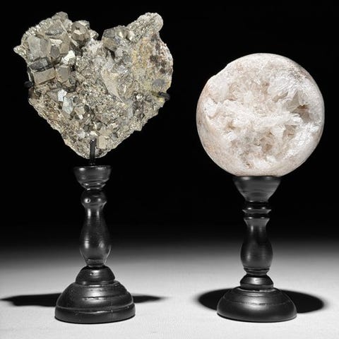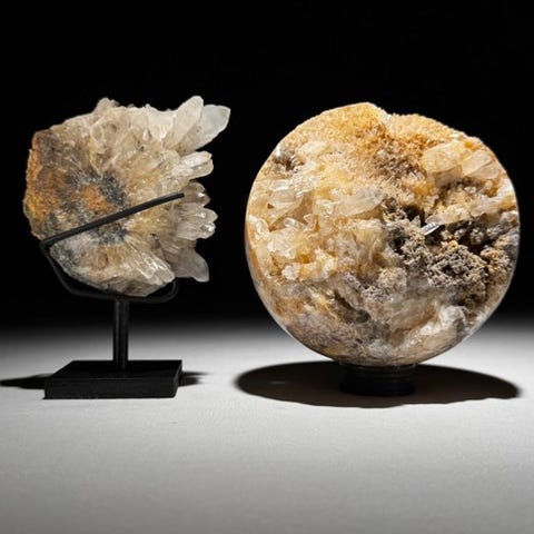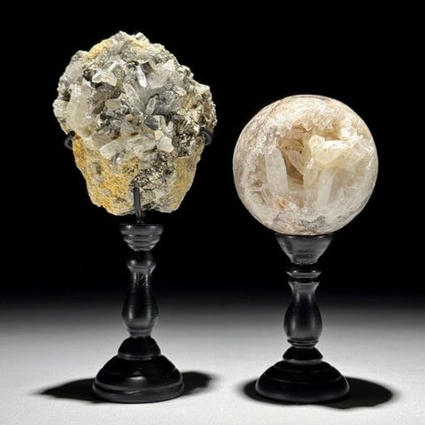 Upea pari: pyriitti-kristalliklusteri ja kvartsipallos, jotka on asetettu räätälöityihin jalustoihin.