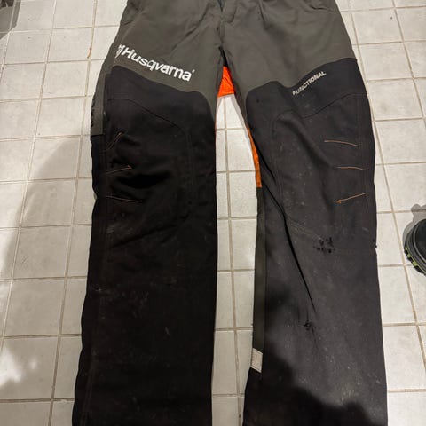 Kuvien mukaiset viiltosuoja housut kaupan. Kunnoltaan hyvät! Kiipeilykenkien piikeistä molempiin lahkeisiin tullut pienet repeämät jotka korjattu.