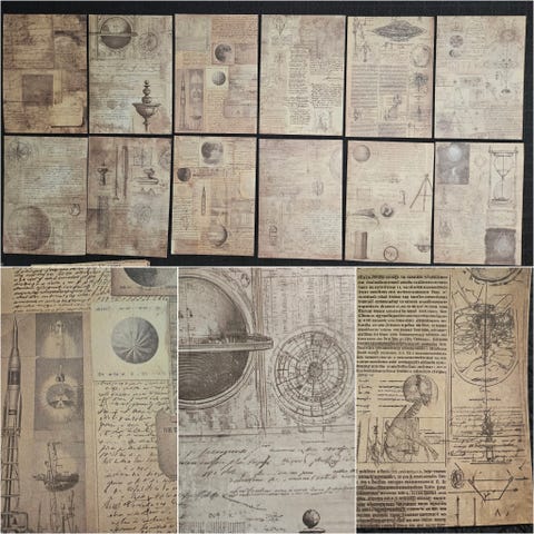 12 kpl uusia todella upeita vintage / antiikki henkisiä papereita erilaisilla tiede / avaruus kuvioilla ja ns. keksityillä teksteillä skräppäykseen askarteluun korttien tekoon tai vaikkapa kehyksiin niin saa todella kauniit taulut sisustukseen! Lisään lähiaikoina paljon erilaisia upeita papereita myyntiin.