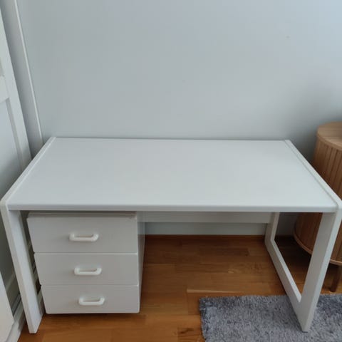 Työpöytä, jossa on musta pöytälevy ja valkoinen puinen runko. Pöydässä on viisi vetolaatikkoa. Pöytä soveltuu esimerkiksi työskentelyyn tai opiskeluun.