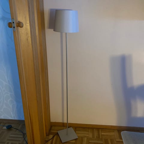 Jalkalamppu jonka korkeutta voi säätää, varjostin on helppo vaihtaa, tukeva.