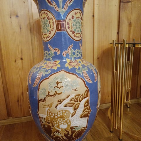 Jotexin maljakko. Korkeus noin 24cm leveys noin 26cm. Ollut alunperin ruskea mutta maalattu valkoiseksi.