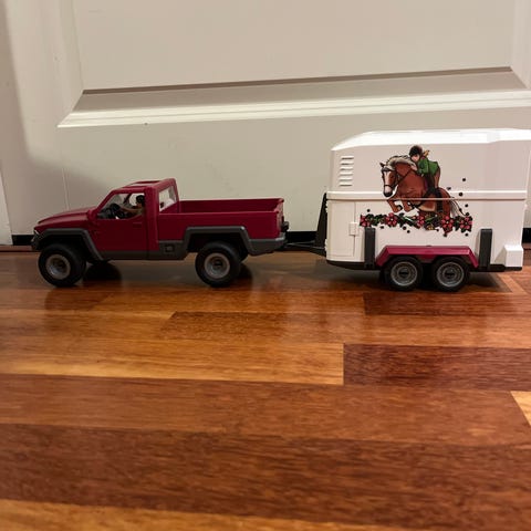 Ihan suosikkileluna ollut ja paljon leikitty Schleich auto ja hevostraileri. Auton pelkääjän puoleinen ovi hajonnut ja lähtenyt irti, ei kuitenkaan vaikuta autolla leikkimiseen, kaikki toimii. Auton ohjaamoon ja lavalle voi laittaa kyytiin ihmisiä / eläimiä ja hevostrailerin luukku aukeaa ja sinne saa kyytiin hevosen.