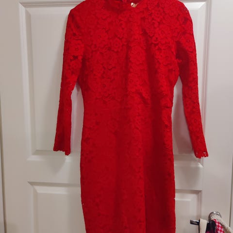 Hennon vaaleanpunainen mekko, jossa frillakaulus ja alusmekko. Oikealla sivulla 35 cm pitkä vetoketju. Materiaali 55% polyesteri, 45% puuvilla. Kooltaan kokomerkintää pienempi, vastaa paremmin kokoa 38.