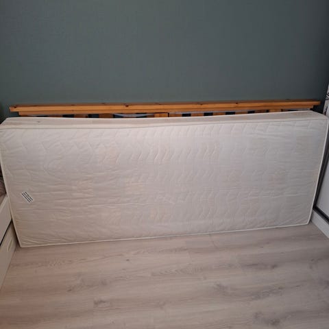 Yksi 120 cm sänky, yksi 90 cm sänky petareineen. Kaksi kappaletta 90 cm patjoja ja yksi paksu 80 cm patja. Olleet varakäytössä ja säilytetty aitassa.
