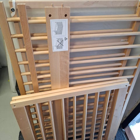 IKEA Minitude pinnasänky on lasten huonekalu, joka on suunniteltu pienille lapsille. Sänky on valmistettu vaaleasta puusta ja siinä on pystysuorat laiturit. Maalattu Roosan Beige värillä. Sängyn yläpuolella on roikkuva "Prinsessa" kangasverho, joka on vaaleanpunainen.