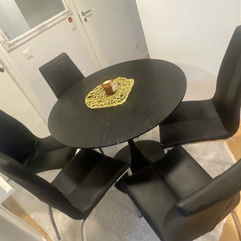 Myydään erittäin hyväkuntoinen ruokailuryhmä, vähällä käytöllä ollut. 4kpl konjakin värisiä keinonahka tuoleja. Pöydän pituus:120cm. Ehjät, siistit ja hyvänkokonaisuus. Nyt jyskissä tarjouksessa 250€. Nyt muuton edestä edullisesti.
