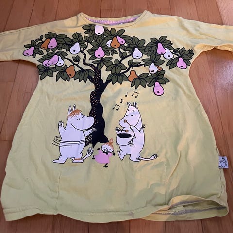 Uudet keltaiset paidat. Muumi-paidassa koko 100cm ja Hai-paidassa koko 92cm, mutta on reilu kooltaan. Vastaavat mielestäni 98cm kokoa.