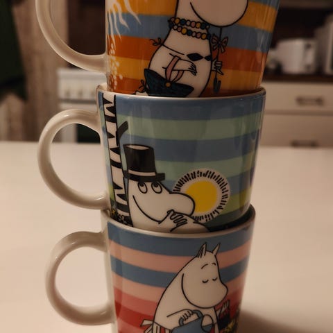 Kiinnostuksen lopahdettua myyntiin muumimukeja. Kaikki kerralla