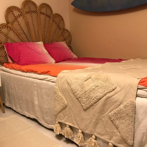 Kohtalainen kunto, ikäisekseen hyvässä kunnossa. Ruuvinjäljet jää sängyn taa piiloon, jos reiät ei tule käyttöön, ne noin 29 cm korkeudella lattiasta mitattuna. Meillä ollut ihan sängynrungon ja seinän välissä ilman kiinnitystä.