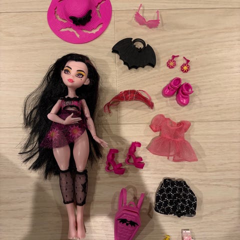 Monster High nukke Draculaura, jolla on Dot Dead Gorgeous Operetta -nuken mekko ja laukku.