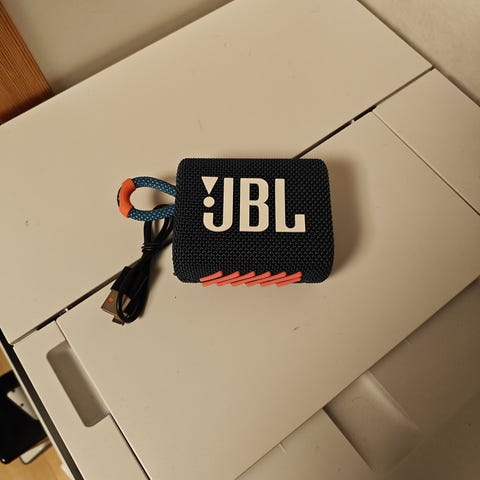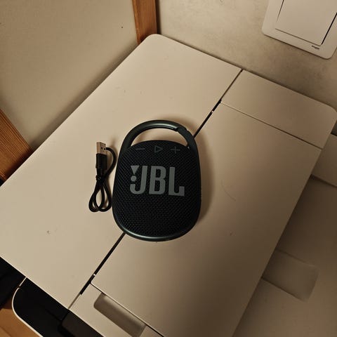 JBL kaiutin valkoisella värillä. Langaton Bluetooth-yhteys, kannettava muotoilu ja kestävä materiaali.