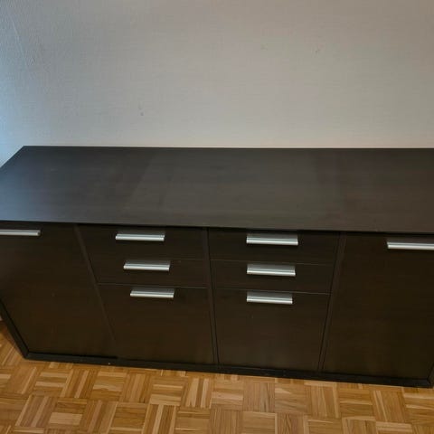 Valkoinen kuvien mukainen senkki. Kaksi ylintä vetolaatikkoa. Alimmat sarana ovet.