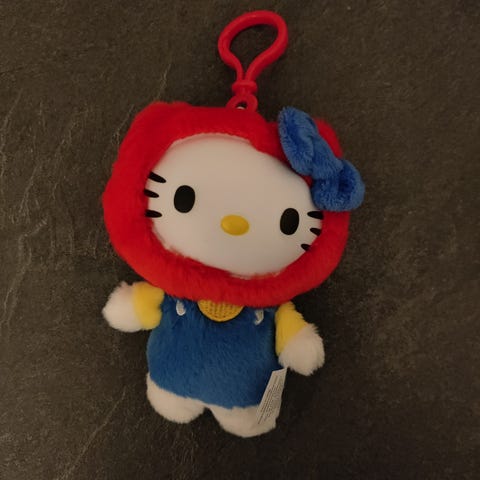 Hello Kitty yllätyspakkauksesta saatu Hello Kitty pehmo, jonka saa laitettua roikkumaan. Alkuperäinen laatikko tulee mukaan.