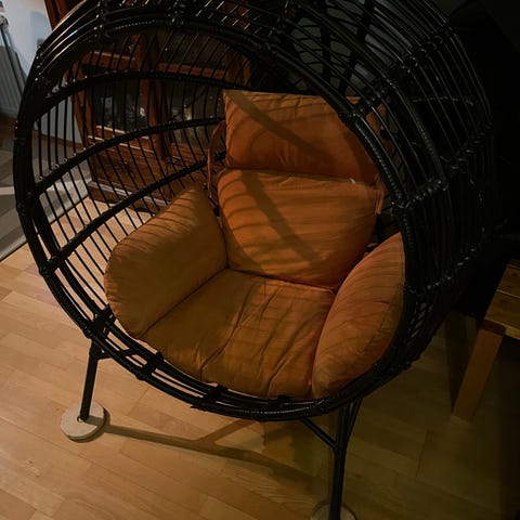 Pentikin liikkeestä ostettu. Vesihyasinttia. Siistikuntoinen tuoli muhkealla pehmusteella.