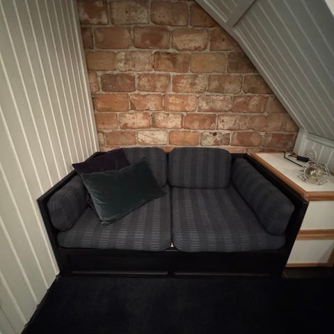 Rungoltaan ehjä, tyynyjen päälliset kuluneet, toinen käsinojan pehmusteen kangas kulunut (kuva).
