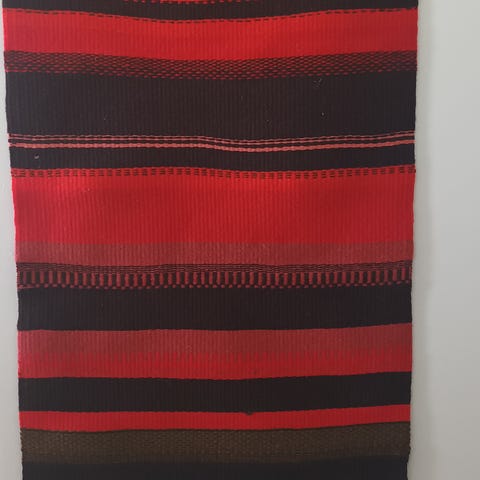 Kudottu raanu, hyväkuntoinen, värit kirkkaat. Ylhäällä tankokuja.