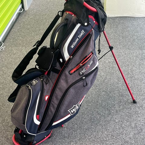 Golfbag, värit sininen ja valkoinen, materiaali nahka. Useita taskuja ja kantohihna. Sopii golfmailojen kuljettamiseen ja säilytykseen.
