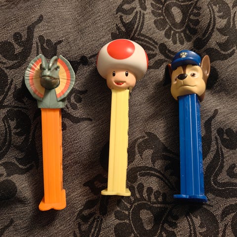 Settinä 4 kpl koristeina ollutta Pez-karkkiannostelijaa: Super Mario, Luigi, Ryhmä Haun Vainu ja Pipsa Possu -sarjan Isä Possu merirosvoksi pukeutuneena. Täysin ehjät ja puhtaat.