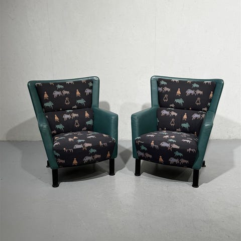 Kinnarpsin valmistama tukeva nojatuoli, jossa on värikäs kuvioitu kangas ja vihreät nahkaosat. Tuolissa on mustat tukevat metallijalat ja se on suunniteltu mukavuutta silmällä pitäen.