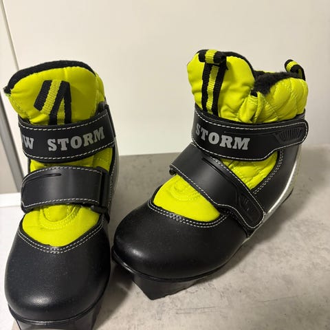 Snow Storm lasten hiihtomono, musta ja keltainen väri, varustettu tarrakiinnityksellä ja lämpimällä vuorella. Soveltuu lasten käyttöön hiihtoon. Kengän pohjassa kuvioitu pito.