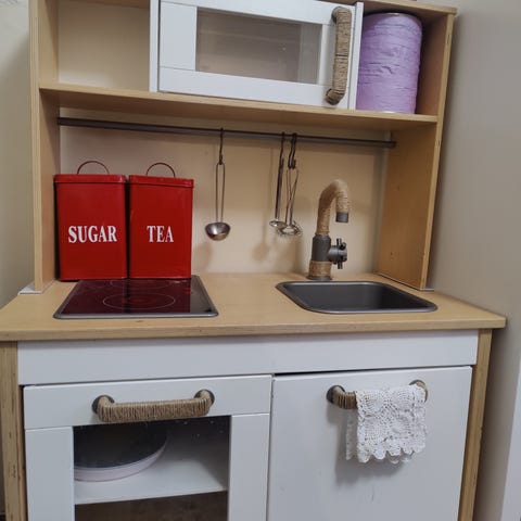 Uutena ostettu ja vähän leikitty leikkikeittiö. Kaikki kuvassa näkyvät irto (keittiö) tavarat kuuluvat kauppaan. Maksanut uutena n. 150e.