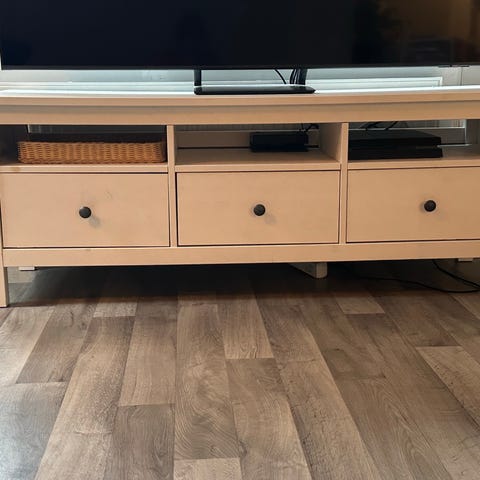 Valkoinen kohtalaisessa kunnossa oleva tv-taso. Melko paljon käytön jälkiä. Yksi vedin hukkunut. Niitä voinee tiedustella Ikean asiakaspalvelusta.
