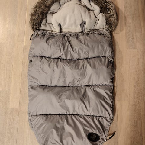 Petite Cherien talvilämpöpussi. Lämmin fleecevuori, tuulta- ja vettähylkivä päälliskangas, irrotettava karvareunus. Aukot valjaita varten. Vetoketjut molemmin puolin niin pussin saa helposti avattua.