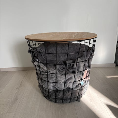Metallinen pyöreä säilytyskori puisilla kahvoilla
