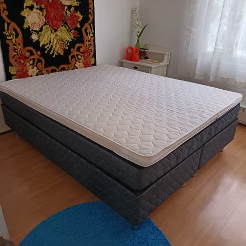 Erittäin iso jenkkisänky. Kingside koko 210 x 210 cm. Siisti ja erittäin hyvä nukkua. Mukana sängyn tausta. Haluttaessa mukaan myös iso puhdas, mutta laikullinen petauspatja.