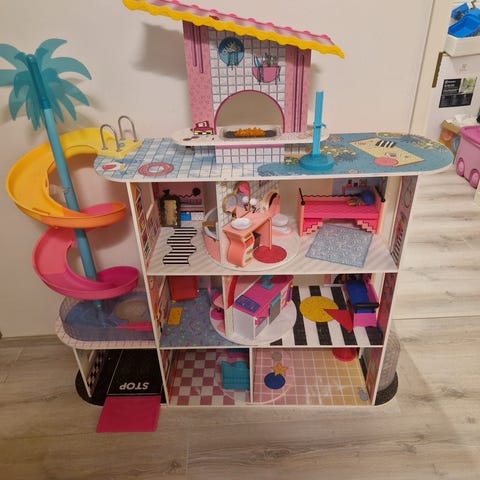 Lol Surprise nukkekoti, jossa on useita kerroksia ja huoneita. Sisältää sisustuselementtejä kuten portaat, takka ja erilaisia huonekaluja. Mukana myös uima-allas ja jäädytettävä luistinrata valolla.