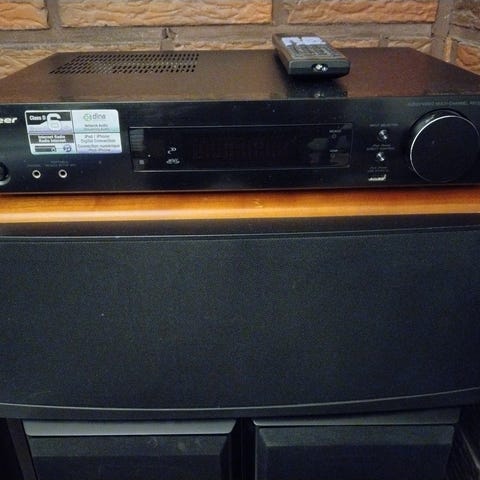 Hyväkuntoiset kaiuttimet ja kotiteatterivahvistin bluetooth-ominaisuudella.