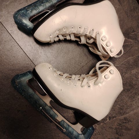 Kenkien nahkapinnassa jo kulumaa, varsissa pehmentymää, muttei murtumia. Sopii hyvin vielä luistelukouluun, ulkojäille tai kaunoluistimien sijaan kouluun laadukkaammaksi jalkaa tukevaksi vaihtoehdoksi.