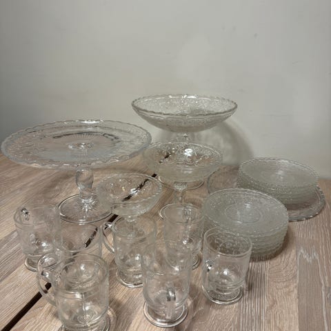 2kpl viini/likööei laseja ja yksi pienempi tarjoulu astia jossa tarra halkaisia 14 ja isompi jonka halkaisia 23 tämän jallassa jälkiä. Kaikki ehjiä