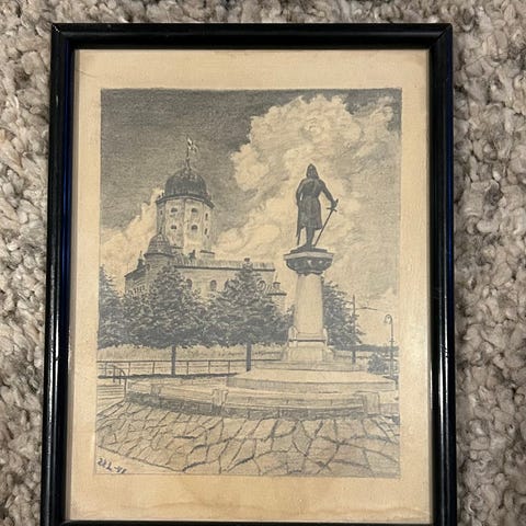 Lyijykynäpiirros "Vossikka" -53. Ajalta jolloin Helsingissä oli vossikoita. Tekijä helsinkiläinen Klaus Eräsuo, ent Enqvist (1903-1963).