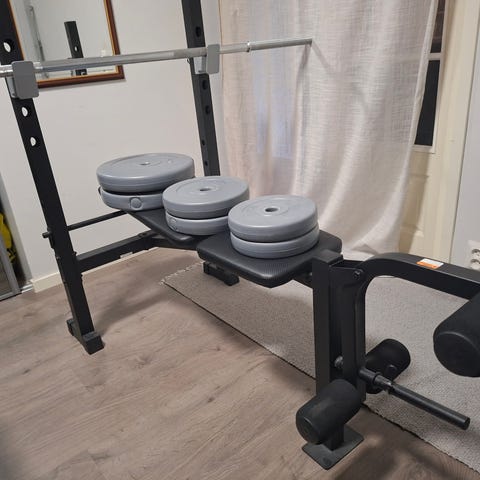 Pientä fiksausta vailla oleva järeä omavalmistepenkki. Pehmusteen kiinnitykseen on vielä muutama ruuvi tallella mutta nyt irti. Painaa melko paljon.