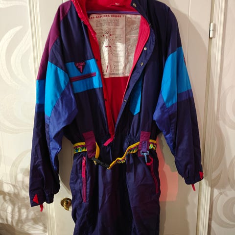 Pirtsakan värinen lasketteluhaalari. Vastannee noin kokoa M. Hoikalle L- kokoiselle saattaa mennä.