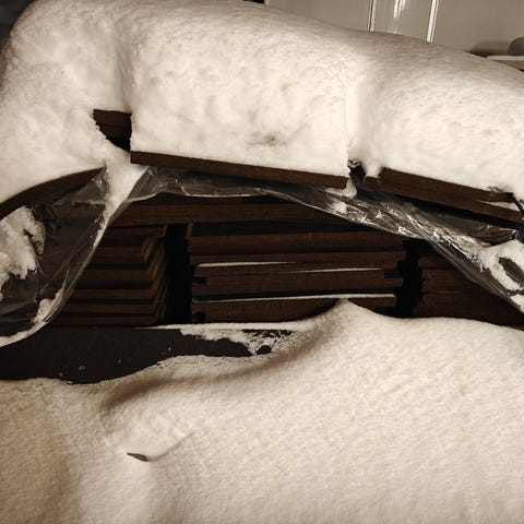 Polyuretaanilevy Recticel Eurothane EWall alunperin 20x1200x2400 mm. Levyä kuitenkin leikattu ja nyt leveys n. 970mm. Leikattu reuna hieman epätasainen. Lisäksi toinen pienempi pala vastaavan yläreunasta, korkeus n. 170mm.