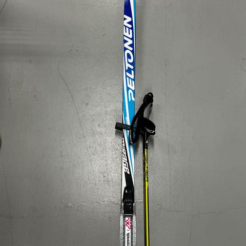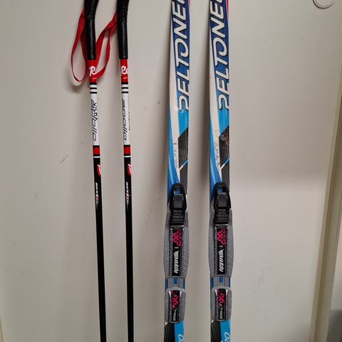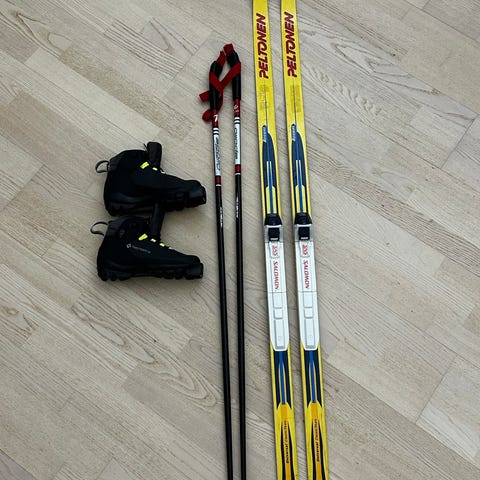 Peltonen lasten sukset 120cm ja monot koko 31. Sauvat 100cm. Yhden talven meillä käytössä olleet.