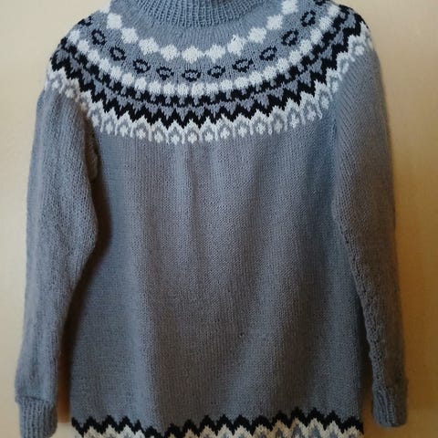 Harmaanruskea villapaita vaalealla kaarrokkeella. Lettlopi 100% Islannin lampaanvillaa. Käsityönä tehty , uusi, juuri valmistunut.