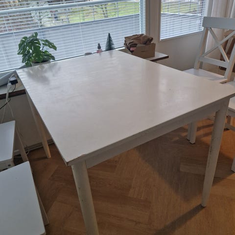 Iso ruokapöytä jatkopalalla. Jatkopala säilyy pöydän kannen alla. Pöydässä normaalia kulumaa ja käytönjälkiä.