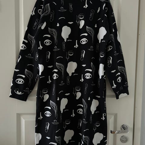 Hyväkuntoinen Vimma-collegemekko, one size. Sivuilla taskut. Kankaan väri hieman haalistunut alkuperäisestä. Molempien taskujen kohdalta saumasta pienet reiät ommeltu käsin. Kai-kai-mitta 49cm, olka-helma-mitta 105cm.