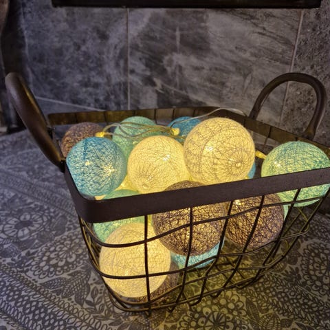 Koristevalosarja, jossa 8 lankapalloa. Väri valkoinen ja tummanharmaa. Toimii 3 x AA paristolla.