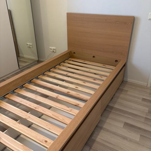 Jysk sänkyrunko, jossa puinen sälepohja ja metalliset jalat, ilman patjaa. Kaikinpuolin ehjä ja siisti. Purettu kuljetusta varten, mahtuu pieneen tilaan, pisin osa 2m pitkä. Jaloissa ostettu erikseen kumiset suojatassut, varmasti ei tule jälkiä lattiaan!