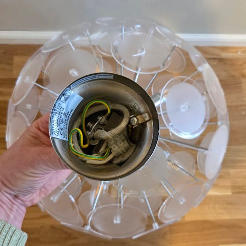 N.80cm halkaisijalla oleva ehyt, tpimiva, polttimoilla varustettu Good designin todella valaisin. Mukaan saat siihen kuuluvan varjostin kankaan.