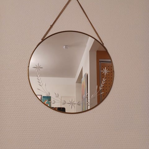 Avaamaton Rustan pyöreä peili, jossa kiinnike takana. Halkaisija 36cm. Nouto Helsinki/Espoo.
