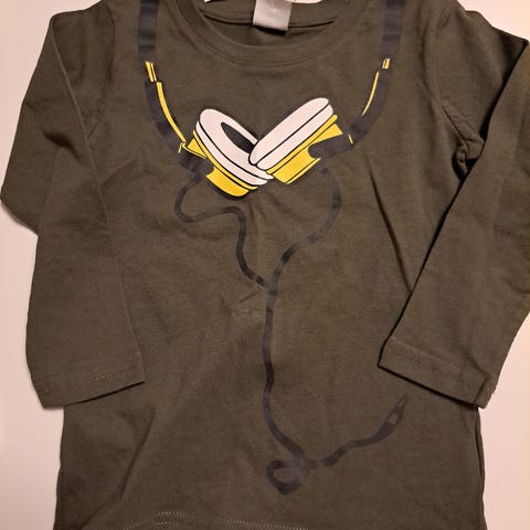 Pari kertaa päällä ollut puuvillapaita, mukavan ohutta pellavantyylistä materiaalia. Luonnonvalkoinen pohjaväri, vihreät raidat. Hihat saa lyhyeksi napilla. Kokomerkintä 92, mutta reilua kokoa, menee myös koossa 98.